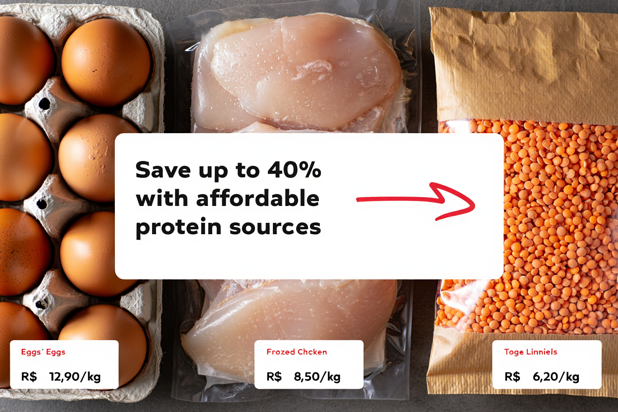 🥚 Fontes de Proteína: Ovos (em cartelas econômicas), peito de frango congelado, atum em lata e leguminosas como feijão e lentilha — opções de proteína barata com excelente valor biológico.