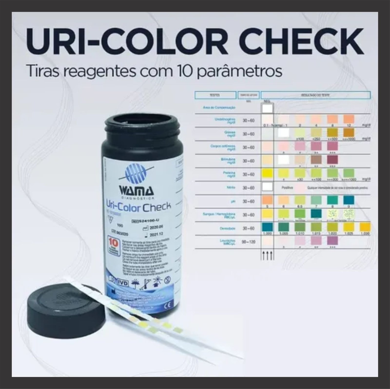 Saúde em Minutos! 🧪 Uri-Color Check (Tiras de Urina) C/200 da Wama. 10 parâmetros de análise para resultados rápidos. Apenas R$39,90. Garanta o seu kit agora! 🛒🩺