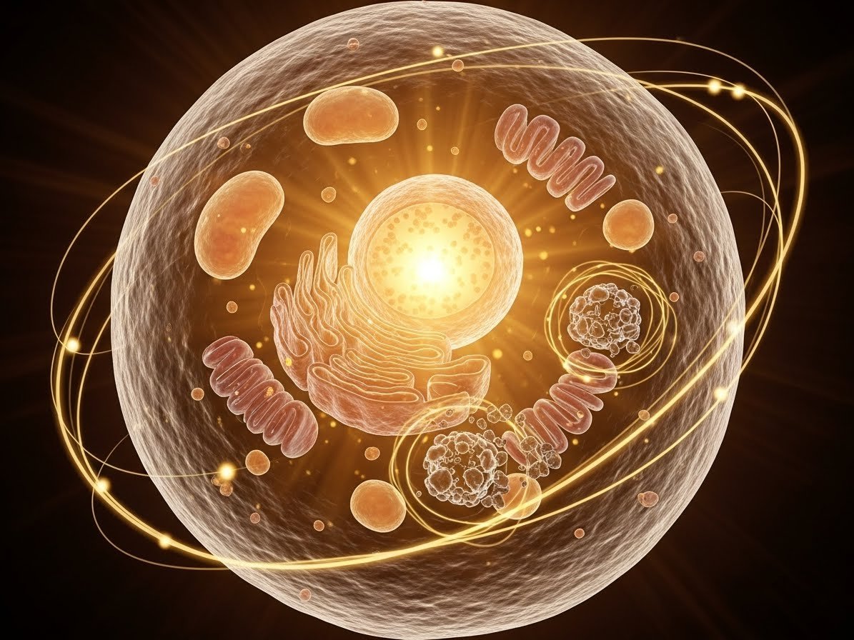 Esta imagem convida você a enxergar além do que é visível a olho nu. A célula iluminada simboliza os processos internos que são ativados quando o corpo é exposto a estímulos horméticos, como o jejum, o exercício intenso ou o estresse térmico.