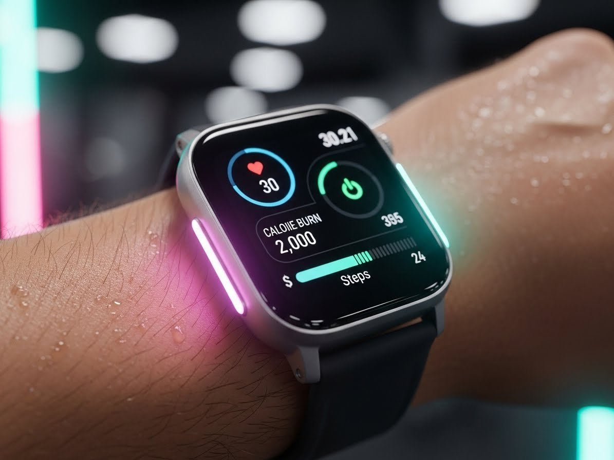 1. PROMPT: CLOSE-UP EM ESTILO MACRO DE UM SMARTWATCH MODERNO MONITORANDO DADOS DE SAÚDE NO PULSO DE UM ATLETA, COM ILUMINAÇÃO NEON SUAVE E FUNDO DE ACADEMIA DESFOCADO.