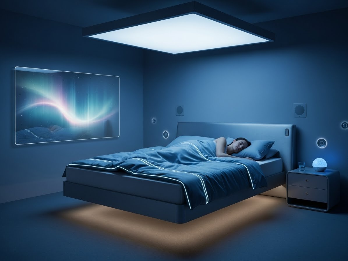 2. PROMPT: AMBIENTE DE QUARTO SERENO E TECNOLÓGICO, COM FOCO EM UMA PESSOA DESCANSANDO PROFUNDAMENTE, CORES FRIAS E CALMAS, TRANSMITINDO RECUPERAÇÃO MÁXIMA.